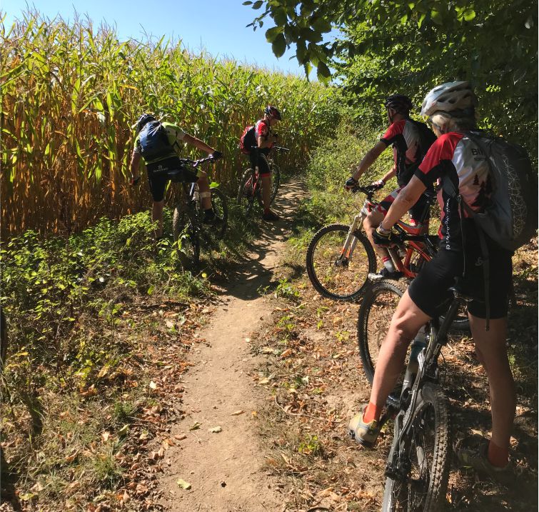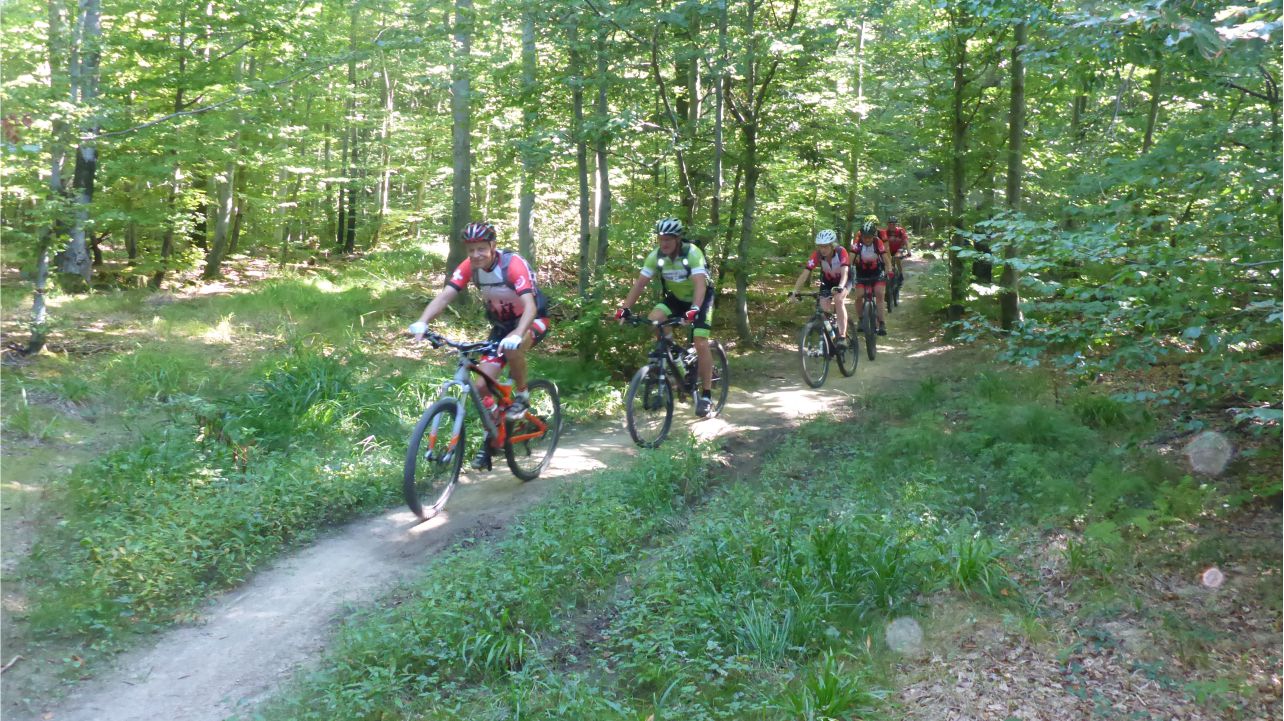Unterwegs auf den kilometerlangen flowigen Singletrails durch den Eichwald…. Bei den immer noch trockenen Wegen nutzten wir die Gelegenheit nochmals die Singletrails zwischen Biel-Benken und Wolschwiller zu fahren. So starteten wir als 7er-Gruppe in Münchenstein und fuhren durchs Bruderholz und weiter via Therwil – Biel-Benken – Eichwald – St. Brice – Wolschwiller – Burg – Flüh und wieder zurück nach Münchenstein. Zwischen Burg und Flüh kamen wir dann nochmals in den Genuss von schönen Singletrails….